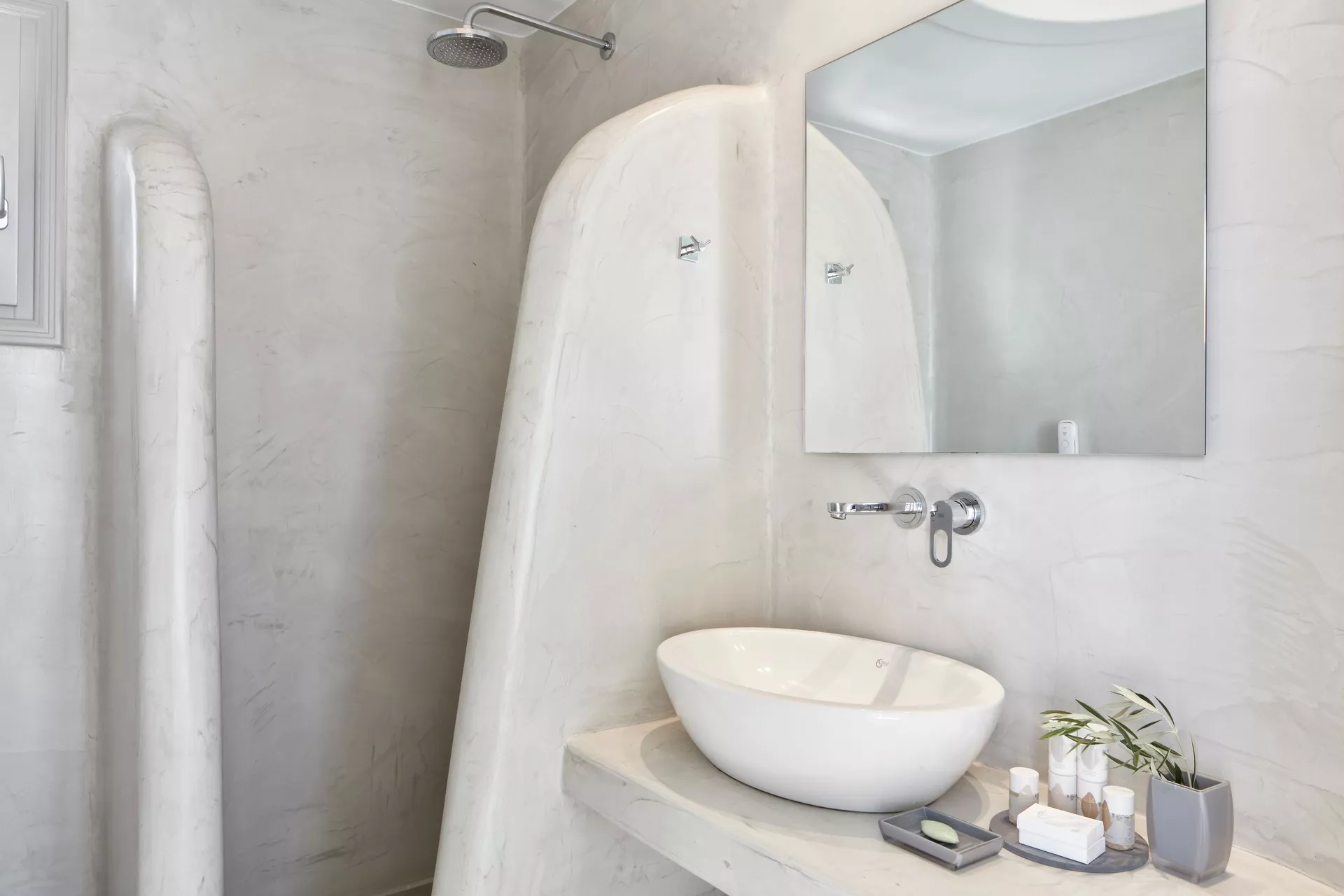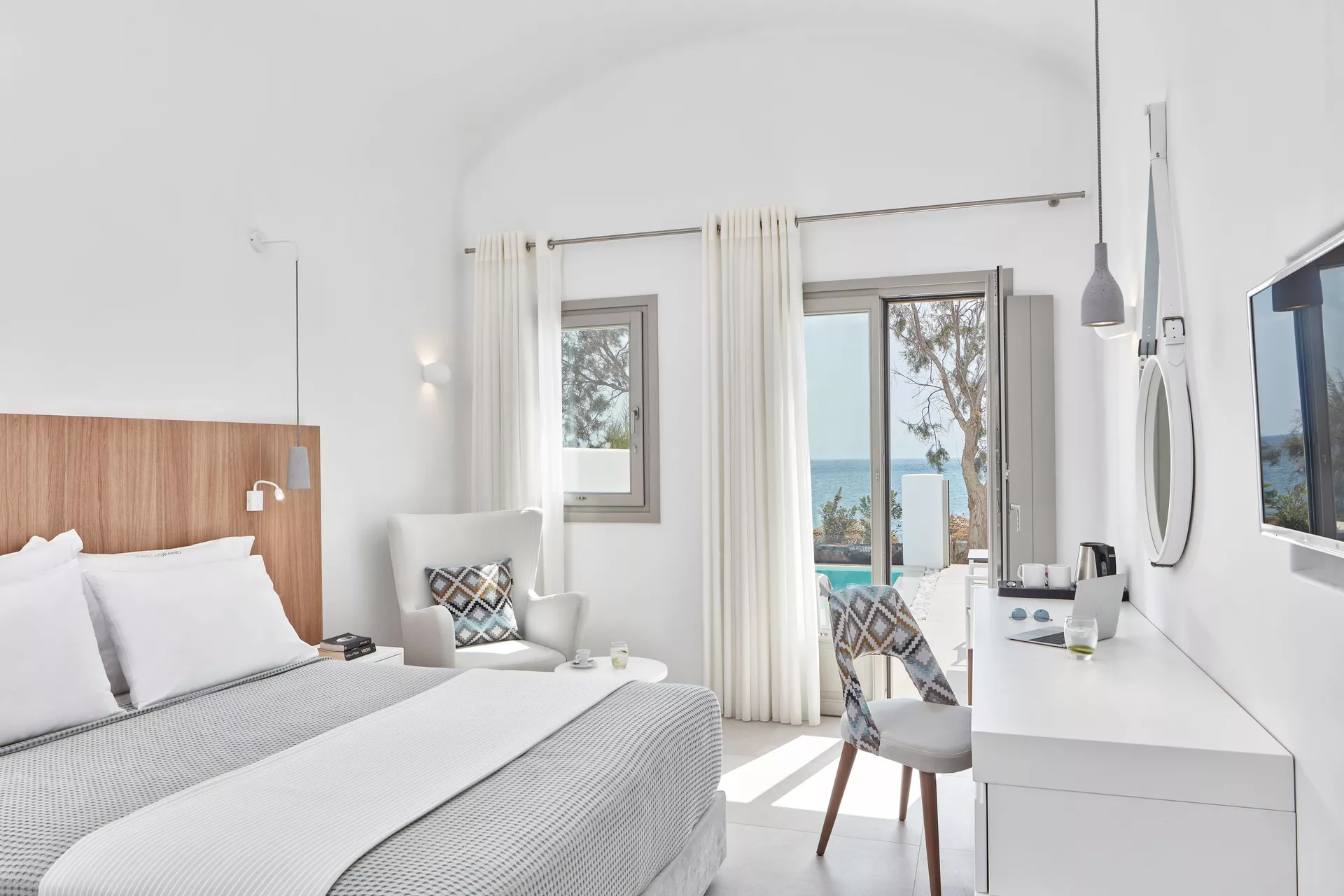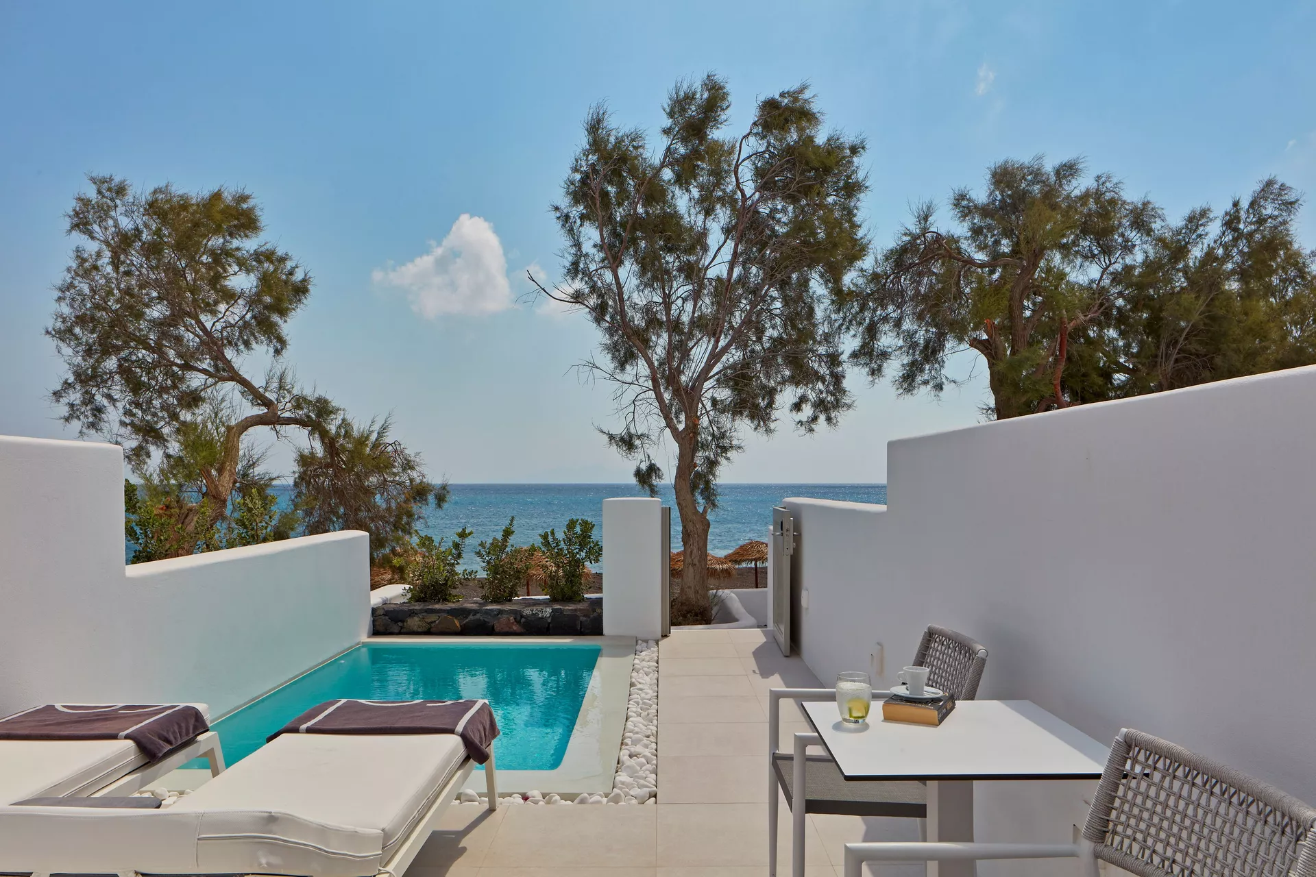 One double bed or two twin beds with air-conditioning (heat & cold), mini fridge, direct dial telephone, satellite-TV (No Greek channels available), private safety deposit box, hairdryer, shower, terrace with private pool and views to the sea.